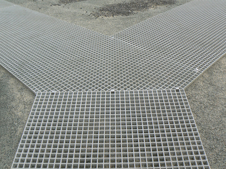 Square mesh molded fiberglass grating has a bi-directional span, which maximizes panel utilization. Furthermore, the use of fully wetted fiberglass rovings embedded in resin provides superior corrosion resistance for most industrial applications.