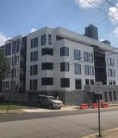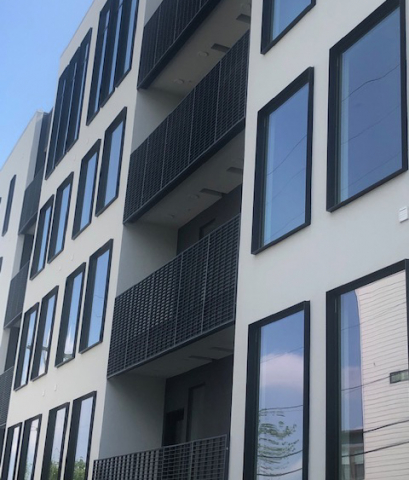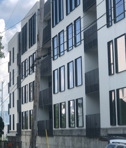 Direct Metals® supplied 2,166 sq. ft. or 116 pieces of IFR25 Slate Grey custom architectural molded fiberglass grating panels for the balcony handrail infills at a condominium complex in Nashville, TN. The fiberglass handrail infills measured 1.5" thick and were sanded smooth. The mesh pattern was a custom 2-3/8" x 8-1/2" rectangle, providing strength and a high open area for clean sight lines. The molded fiberglass grating material was chosen for this application because of its corrosion resistance and durable properties that help the handrail infills hold up to weather conditions. One of the advantages of the fiberglass is the color is throughout the product, not on the surface, such as paint on a metal railing. This enables color consistency over time if the panels are ever bumped, scratched or damaged. Fiberglass handrail infills are available in multiple colors and are easy to fabricate to meet project specifications.
