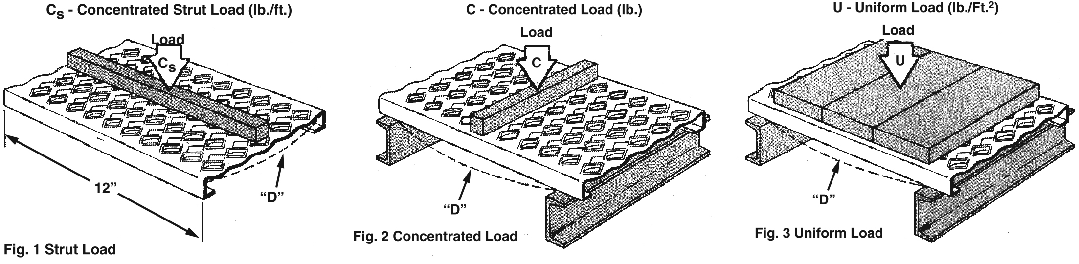 Values indicated in the rows adjacent to "U" are of the (1) maximum allowable uniform loads considering channel flexure and (2) maximum grating surface flexure.